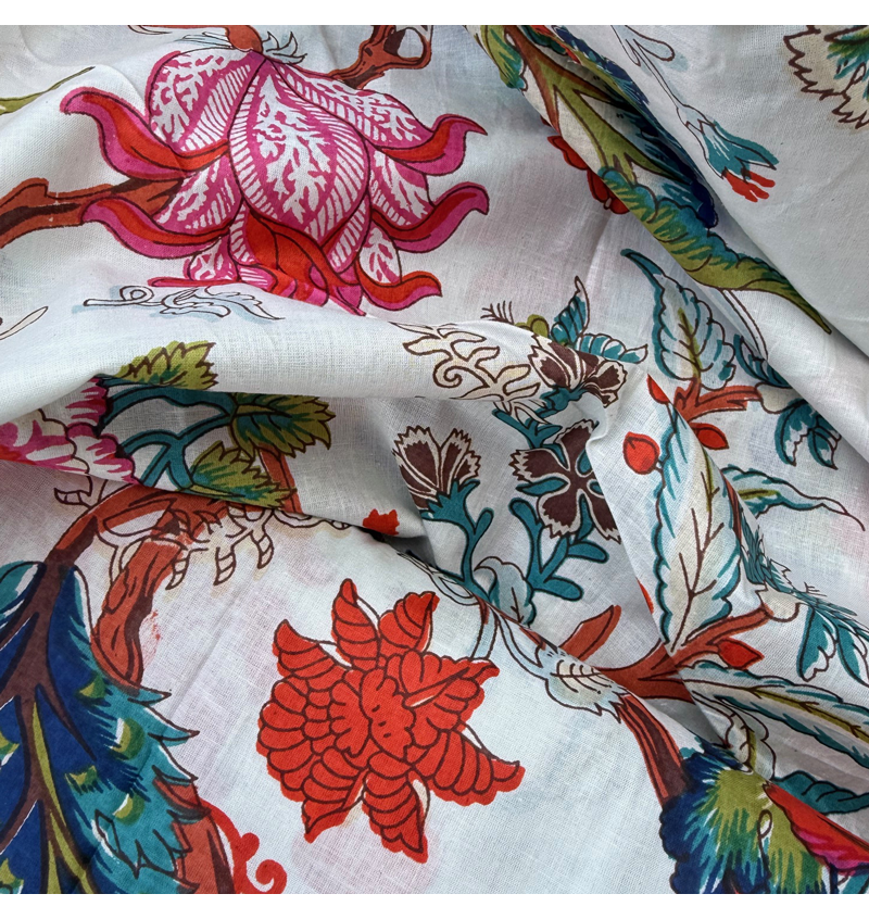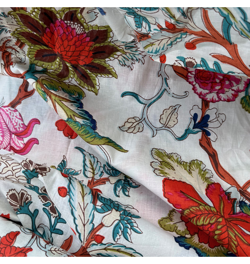 Bellissimo tessuto adatto alla realizzazione di bluse, vesti ampi e freschi, gonne arricciate per la stagione estiva. Questo tessuto ha una stampa irregolare e viene dall'India.